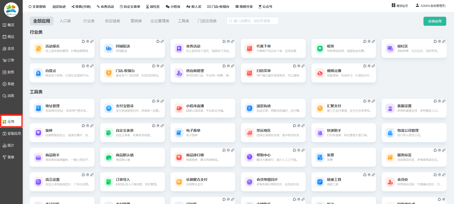 目录 搜索 展开 一、前期准备资料二、数字乡村码-上线操作指南1、服务号的申请流程及认证2、申请小程序流程3、开放平台绑定小程序和公众号三、数字乡村码-系统操作数字乡村码系统管理-概况数字乡村码-商品管理1、发布商品2、商品列表3、商品表单4、商品分类5、品牌管理6、配送模板7、评论管理8、优惠券管理9、商品标签10、退货地址设置11、满额优惠12、批量操作13、配送方式14、基础设置15、商品隐藏四、数字乡村码-会员管理1、全部会员2、会员等级3、会员分组4、资格申请5、会员设置6、推广中心设置7、会员邀请码8、会员关系链修改关系链修改记录9、会员合并记录10、账号注销管理11、会员设置中心五、数字乡村码-订单管理1、订单管理列表2、订单处理流程3、订单状态4、订单修改价格5、订单退款退货6、多包裹发货7、批量发货订单操作步骤8、催发货订单9、物流查询六、数字乡村码-财务管理1、余额设置2、会员余额3、充值记录4、转让记录5、余额明细6、收入明细7、提现设置8、提现统计9、积分管理10、转账审核11、收益广告12、批量充值七、数字乡村码-系统管理1、商城入口2、商城设置①、商城设置②、订单设置③、物流查询④、短信⑤、联系方式⑥、分类⑦、优惠券⑧、分享⑨、幻灯片⑩、广告位⑫、地图设置3、交易设置4、微信模板消息自定义消息模板(新版)自定义消息模板(旧版)小程序消息模板公众号模板消息变更公告5、语言设置6、权限管理7、多媒体管理八、数字乡村码-消息管理九、数字乡村码-应用管理十、数字乡村码系统-数据统计十一、数字乡村码-页面装修DIY1、模板管理2、店铺页面3、顶部导航4、底部导航5、DIY模板市场6、首屏广告7、基础设置8、装修DIY尺寸建议十二、供应商功能插件操作指南1、供应商2、门店-收银台门店申请和使用步骤门店管理①、门店-收银台 营销设置②、门店-收银台 分润设置门店分类门店申请门店审核门店商品门店商品订单收银台订单数据统计核销员基础设置默认设置门店装修3、微社区4、会务活动十三、营销插件操作指南活动报名提货卡新人奖微店问卷调查积分视频分享1、视频分享基础设置2、视频分享发现管理3、视频分享分类管理4、视频分享评论管理5、视频分享分红记录6、视频分享短视频中心每日红包幸运大抽奖签到优惠券二维码任务奖励优惠劵文章音频文章付费文章限时购新海报拓客卡操作流程积分活动素材中心视频红包十四、入驻门店应用类1、门店预约2、附近商品3、门店定位设置4、门店控制5、门店满额包邮6、门店满额减7、导入商品8、门店搜索9、门店股东10、核销券11、多门店核销1、商城后台设置2、前端功能演示十五、常见问题1、后台登录密码修改流程2、会员-余额,积分,后台如何进行充值与扣除3、如何修改上下级关系4、一种万能的获取商城小程序路径的方法 暂无相关搜索结果! 阅读次数:1454 本文档使用 模王系统 发布 九、数字乡村码-应用管理 九、商城管理-应用显示所有商城已安装并启用的应用,包含以下大类:具体根据自家商城后台系统显示为准。每个应用功能设置步骤较多,请查看相对应应用的学习文档。文档更新时间: 2024-01-08 10:36 作者:链上旅行
