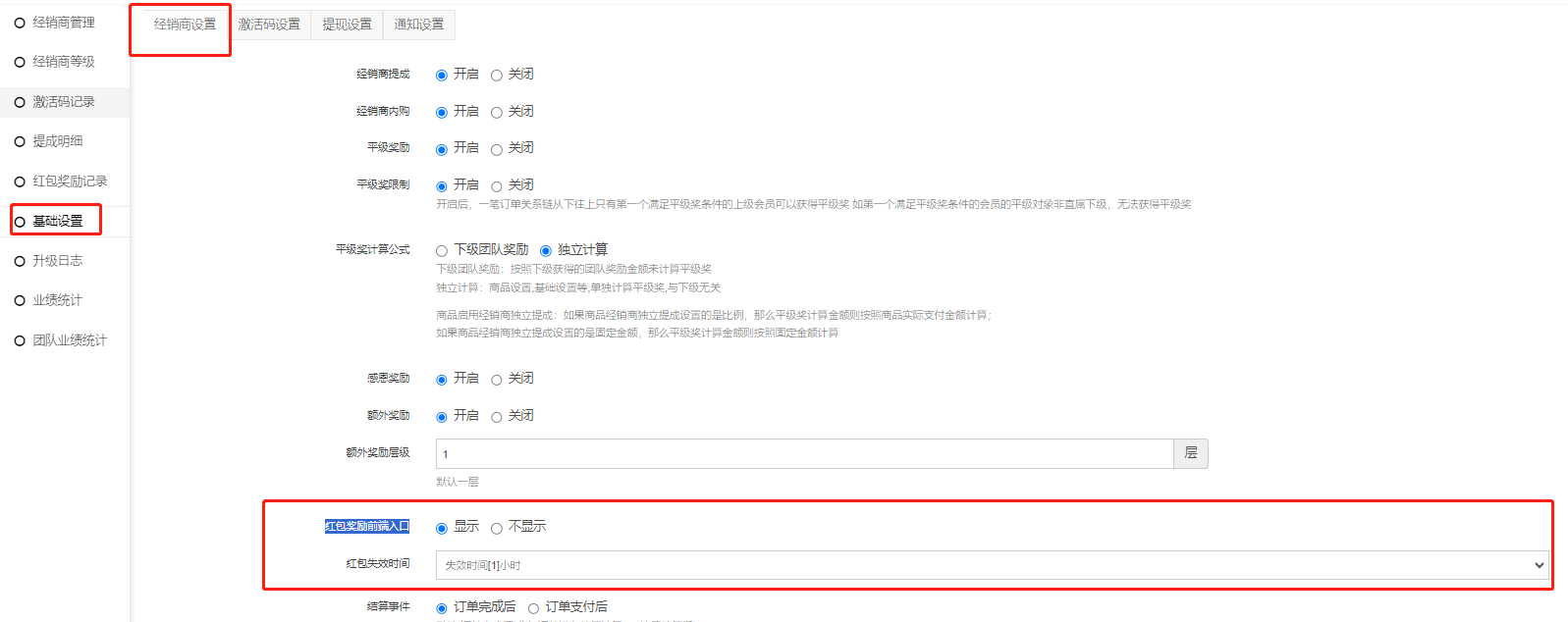 一、基础设置--经销商设置--红包奖励前端入口:显示/不显示